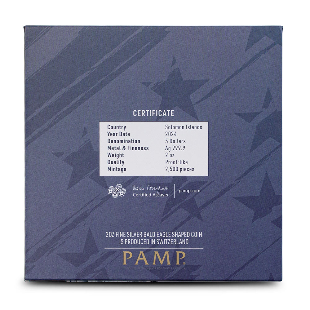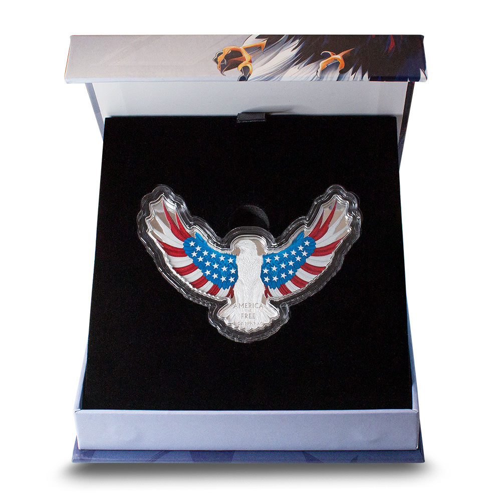 Every 2024 2 oz Colorized Solomon Islands Silver Bald Eagle Coin will make a bold addition to any Americana collection or patriotic display. Each one is encapsulated in a premium box with eagle and flag imagery, along with the all-important Certificate of Authenticity.