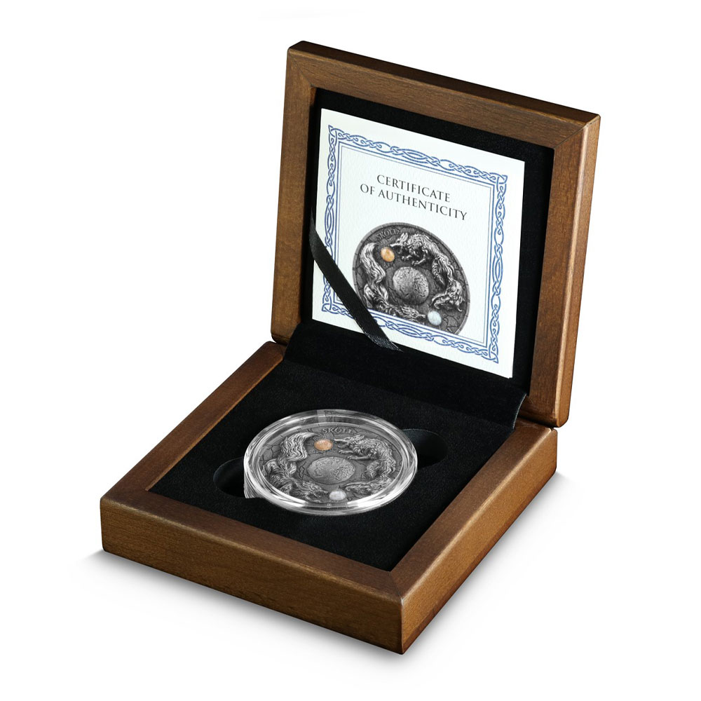Every 2024 2 oz Germania Ragnarok Skoll & Hati Silver Round comes packaged in a wooden box with a Certificate of Authenticity. This is the first design in the Ragnarok Series and is crafted with ultra-high-relief visuals. Each round has a unique UV effect and includes a sunstone and a moonstone.