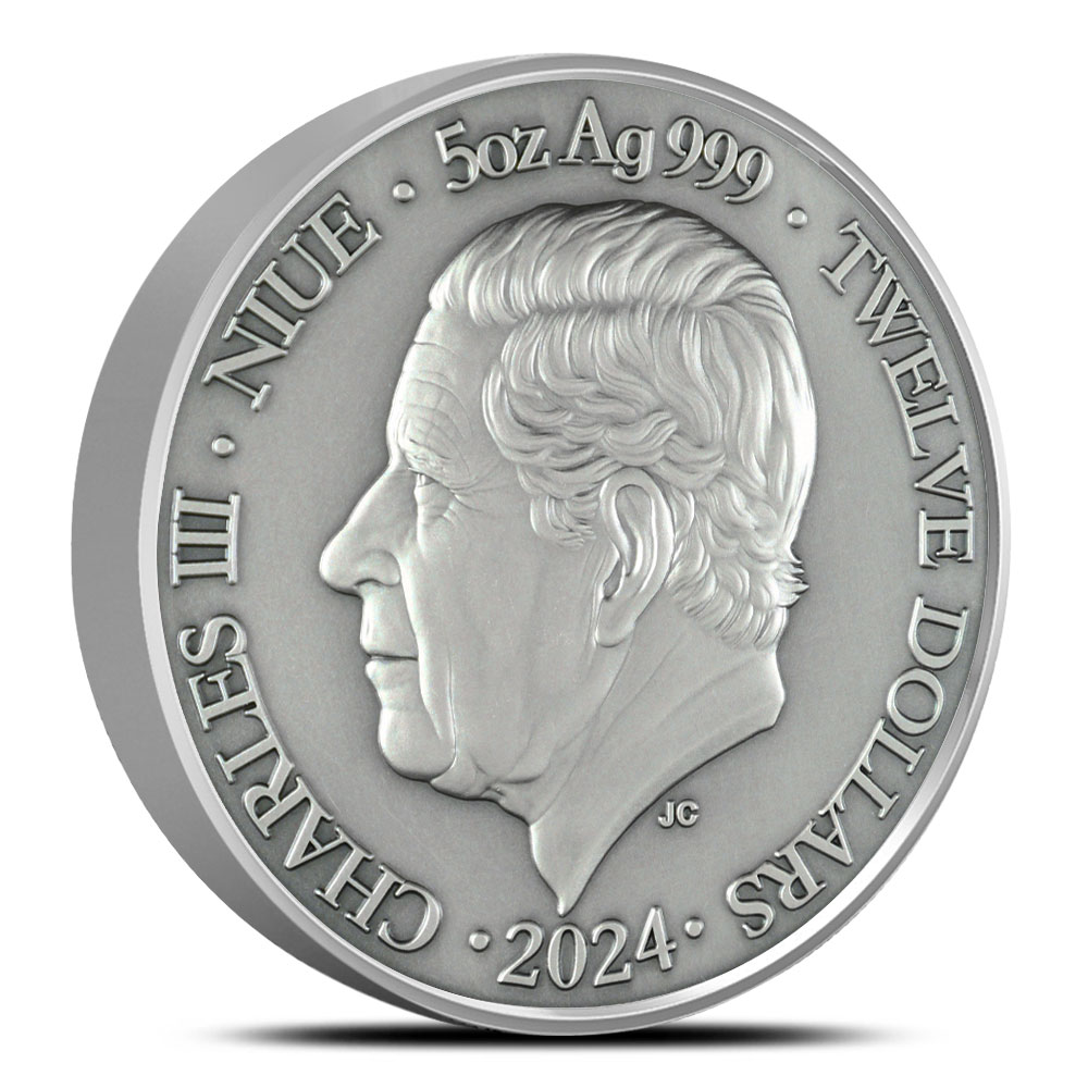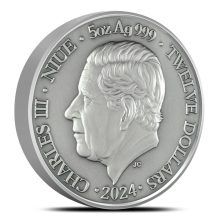 The obverse of the 2024 Antique Niue Silver Scorpio Coin features His Majesty King Charles III. This portrait was designed by Jody Clark, the same artist who crafted the final portrait of Queen Elizabeth II for British coinage.