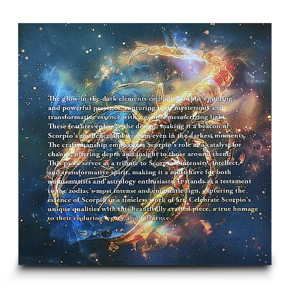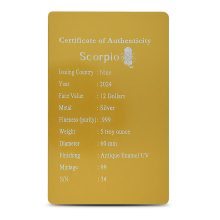 On the reverse side of the 2024 5 oz Antique Silver Scorpio Coin is the image of a scorpion. Scorpios are known for their dual naturewhile they are loyal and protective, they can also be intense and strike when provoked. This complex personality makes Scorpios one of the more fascinating signs of the zodiac.
