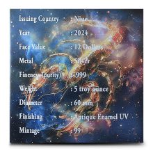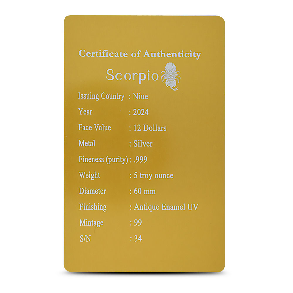 Each 2024 5 oz Antique Niue Silver Scorpio Coin comes in a presentation box with a Certificate of Authenticity. These coins have an antique finish and feature UV colorization on the reverse, allowing the scorpion to glow under UV light.