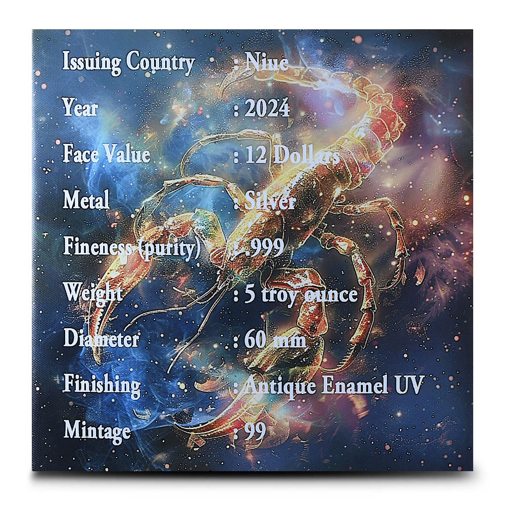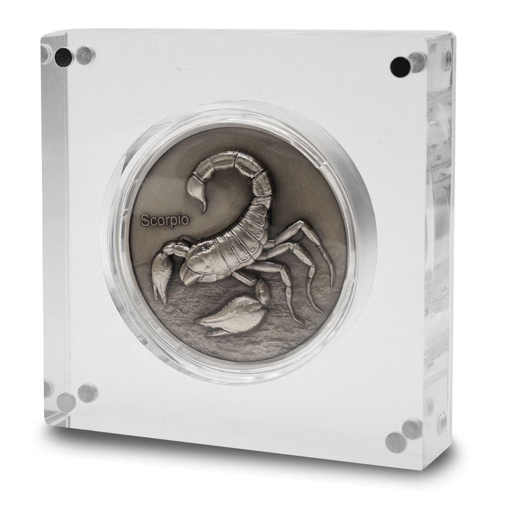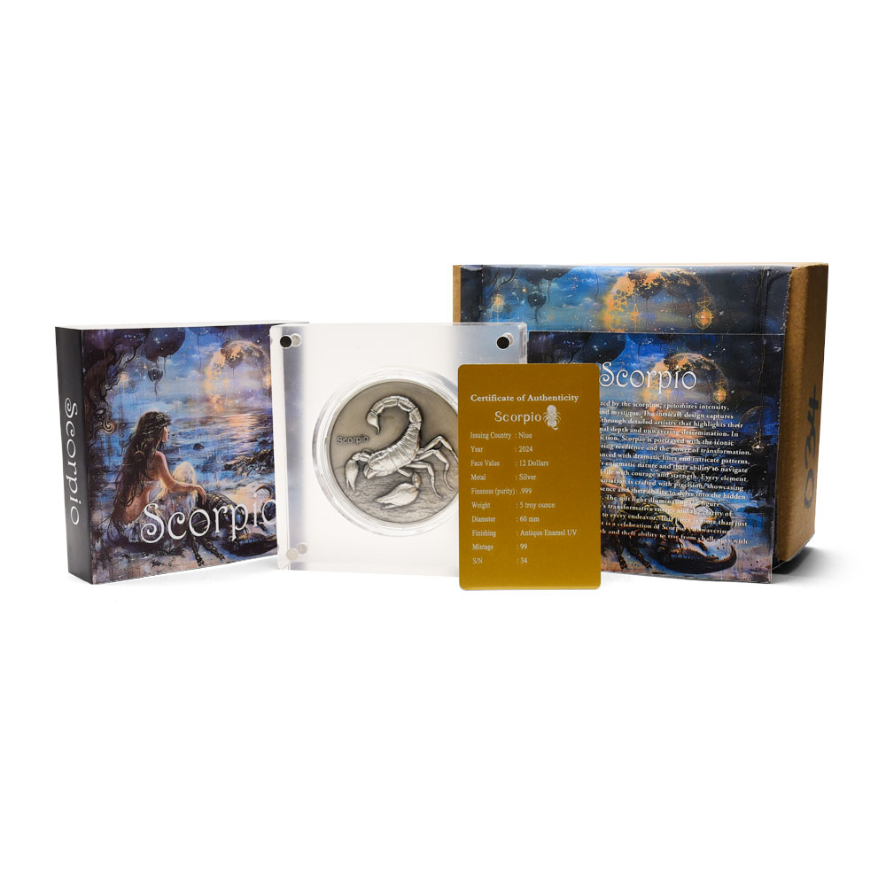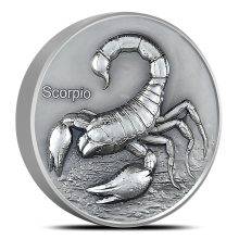 Scorpio is the eighth sign of the zodiac, representing individuals born between October 23 and November 21. The scorpion, which stands for this water sign, embodies Scorpios intense and passionate nature. Those born under Scorpio are known for their depth, loyalty, and strong intuition. Right now, 2024 5 oz Antique Niue Silver Scorpio Coins are available from BGASC.