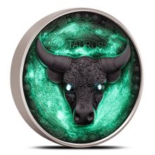 The reverse of the 2024 5 oz Antique Niue Taurus Coin brings the powerful Taurus bull symbol to life with a striking front-facing portrayal. The bull’s eyes and background areas glow in the dark, adding a captivating element. Inscriptions include TAURUS.