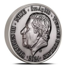 The obverse of the 2024 Antique Niue Silver Taurus Coin features the newest Commonwealth portrait of King Charles III designed by Jody Clark, depicting the monarch’s uncrowned likeness in left-profile relief, surrounded by inscriptions. These inscriptions read 5 OZ AG 999, TWELVE DOLLARS, 2024, CHARLES III, JC.