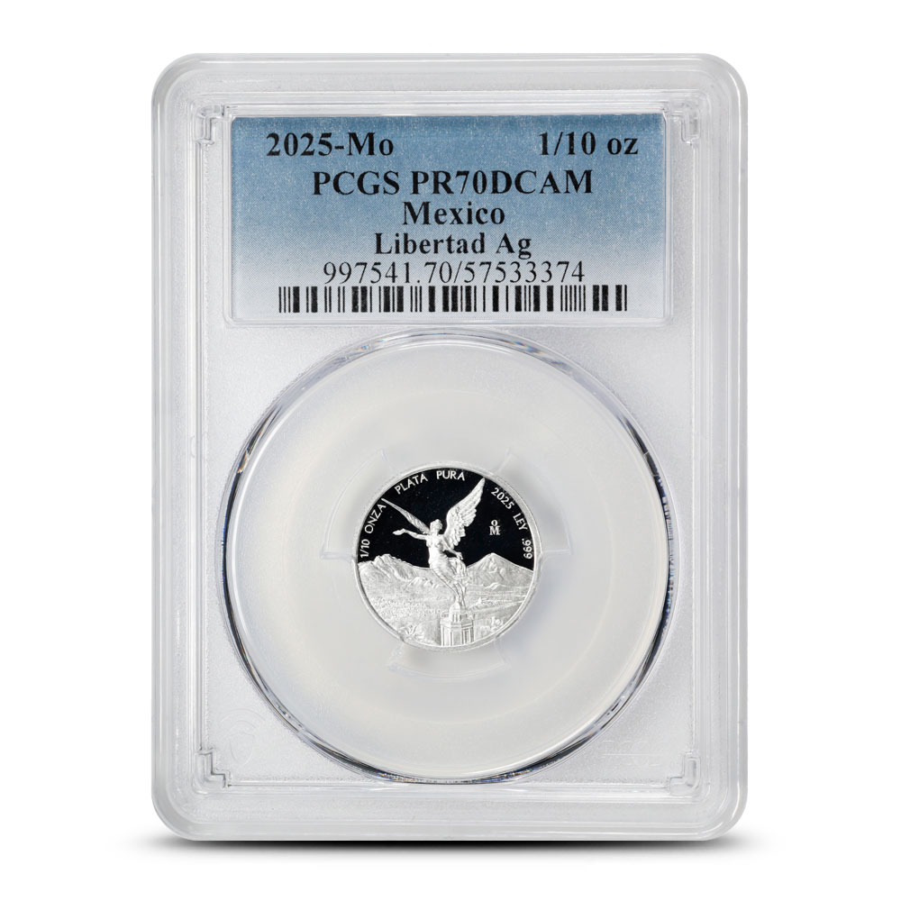 Home » Sovereign & Private Bullion Mints » Mexican Mint » 2025 1/10 oz Proof Mexican Silver Libertad Coin PCGS PR70