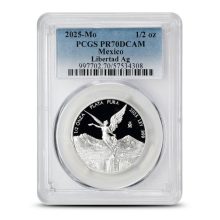 Home » Sovereign & Private Bullion Mints » Mexican Mint » 2025 1/2 oz Proof Mexican Silver Libertad Coin PCGS PR70