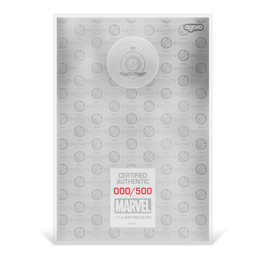 The reverse of the 2025 1.5 oz Proof Silver Marvel Infinity Saga Foil includes colorized imagery adapted from the Doctor Strange movie poster. The characters first MCU appearance came in 2016, portrayed by Benedict Cumberbatch. The movie follows his transition from a gifted but egotistical surgeon to the Master of the Mystic Arts after an accident forces him to give up medicine. The film stood out for its striking, mind-bending visuals.