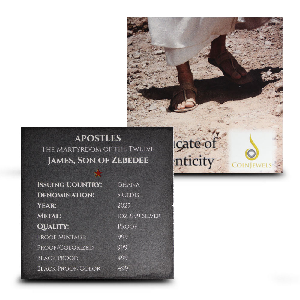 Each 2025 1 oz Black Proof Republic of Ghana Silver James the son of Zebedee Coin ships with an acrylic capsule and a Certificate of Authenticity. These coins are made with a black proof finish, giving the background a darker mirrored look while keeping the raised details frosted.