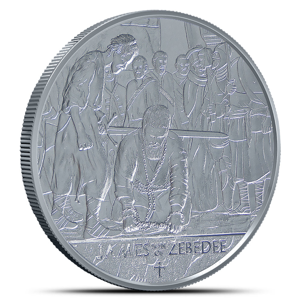 On the reverse of the coin, James is shown in a moment just before his execution. Though Judas died earlier, James was the first of the apostles to die because of his Christian faith. Herod had him executed by sword, marking the beginning of widespread persecution against early believers.