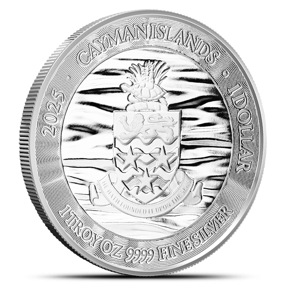 Each 2025 1 oz Cayman Islands Silver Sea Life Stingray Coin features a proof-like look, including frosted devices and shiny mirrored fields. Coins ship in protective plastic flips.
