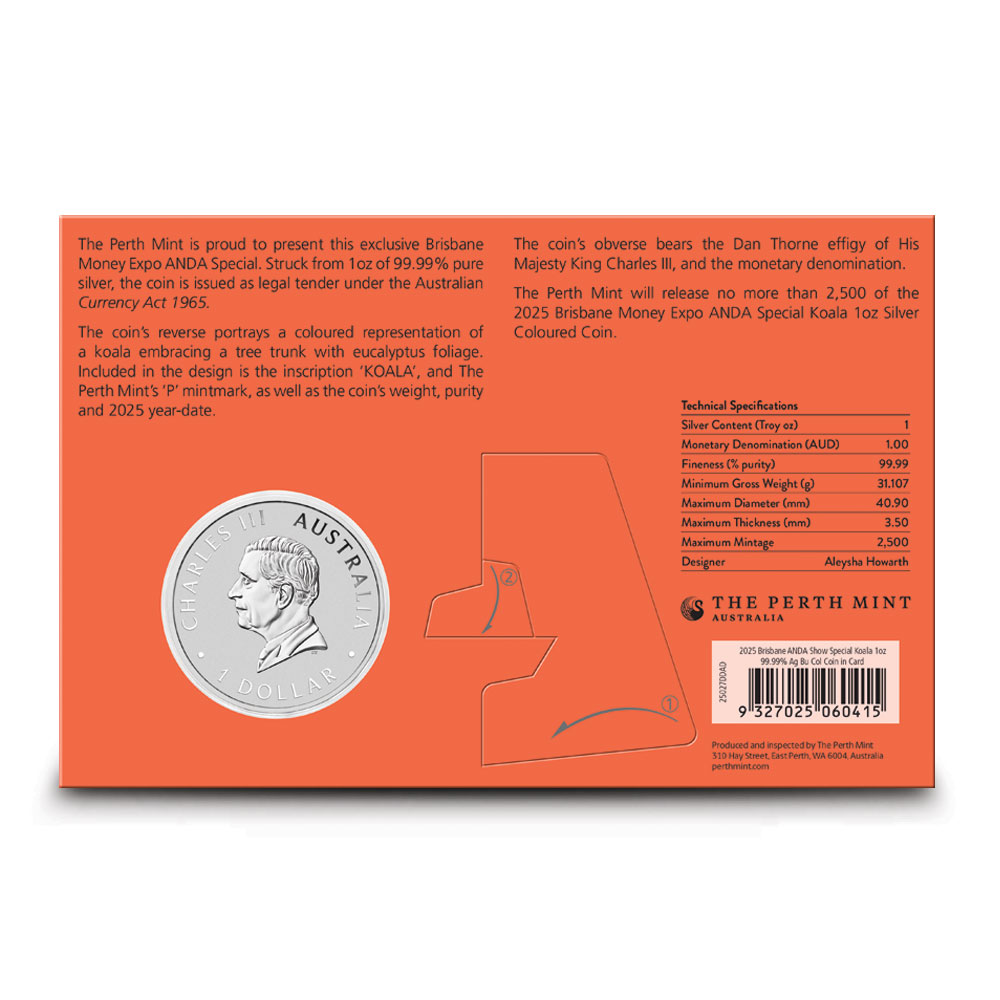 Each 2025 1 oz Colorized Australian Silver Koala Coin comes in a full-color display card from the Perth Mint. The card features a scenic Outback sunset and was made specifically for the Brisbane Money Expo ANDA Show.