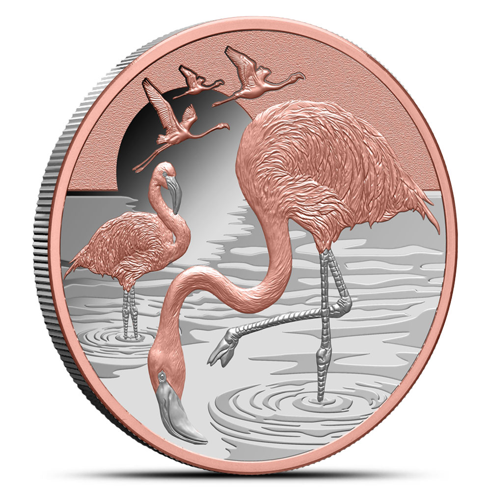 The reverse of the 2025 1 oz Proof Silver Beauty and Grace Pink Flamingo Coin shows five flamingos in a detailed scene. Two are wading in the foreground, while three fly above the horizon. The rose-gold plating is applied to the birds, with the water and sun kept in bright silver to emphasize contrast.