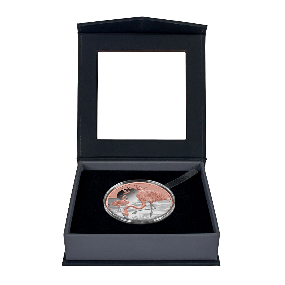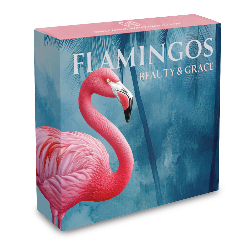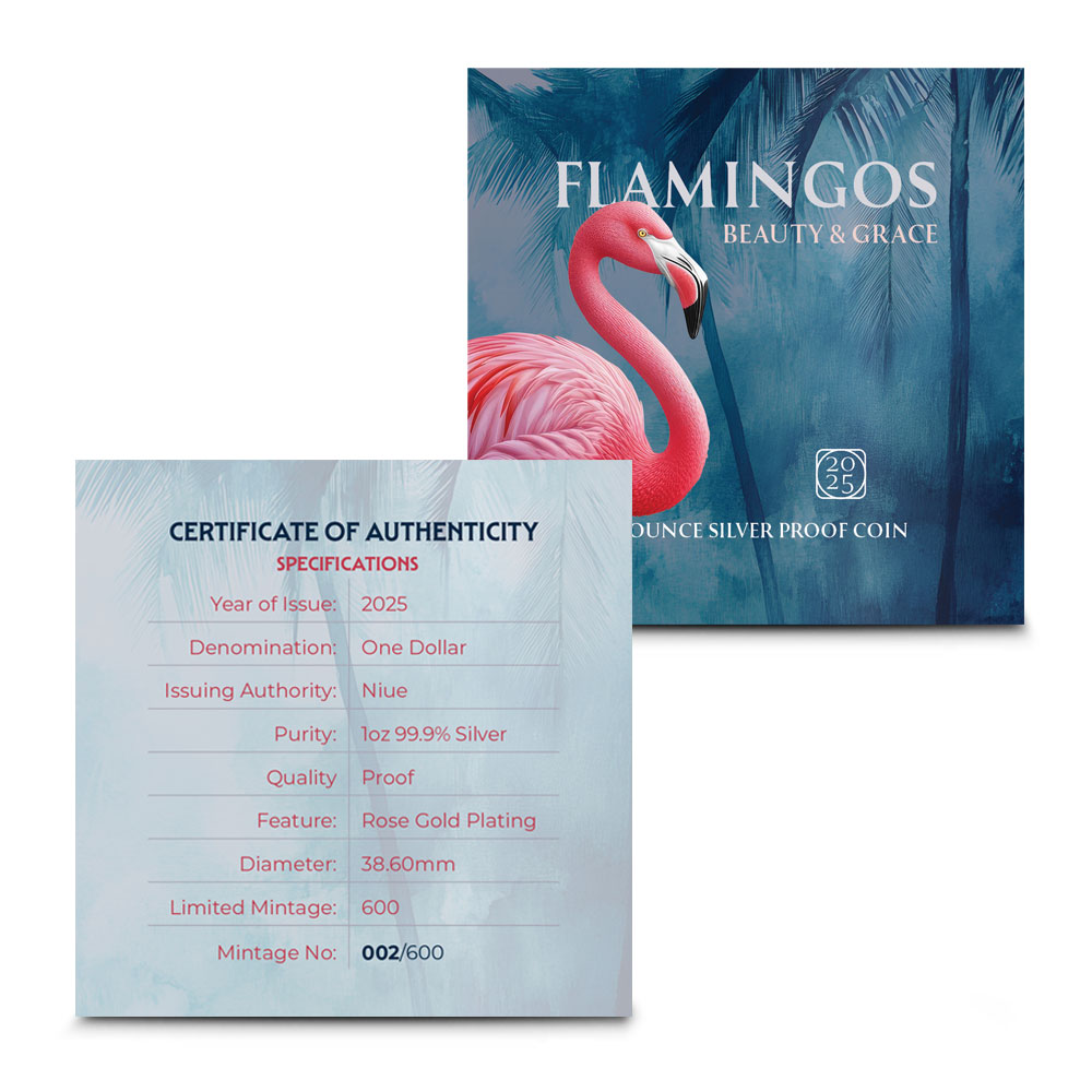 Each 2025 1 oz Niue Proof Silver Beauty and Grace Pink Flamingo Coin comes housed in a presentation box, complete with a Certificate of Authenticity. The coin also arrives inside a themed shipper decorated with flamingo imagery. Select parts of the reverse design are accented with rose-gold plating, and proof visuals highlight the coins details with frosted devices and mirrored fields.