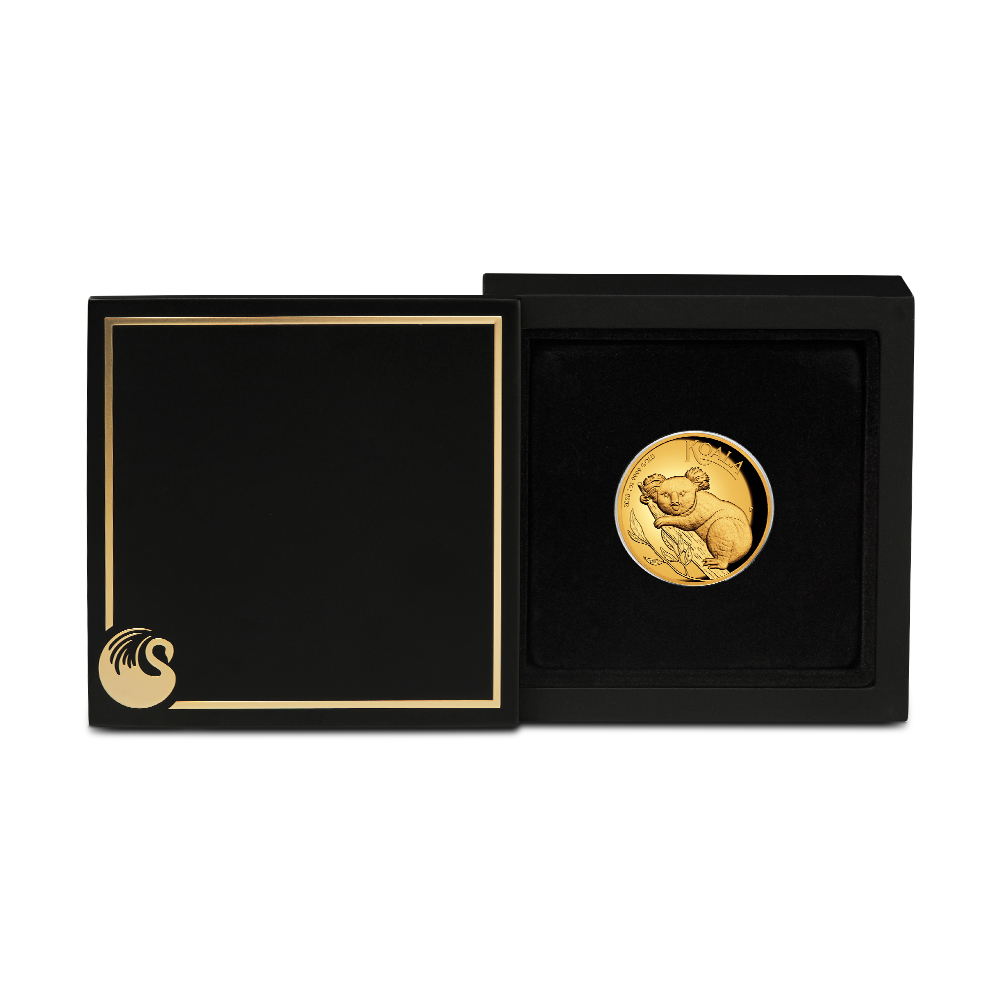 Each 2025 1 oz Proof Australian Gold Koala Coin comes in its own packaging. The coin is housed in a black presentation case from The Perth Mint. It also includes a koala-themed outer sleeve and a Certificate of Authenticity. With its high-relief strike, the design offers deeper detail and a more layered look.