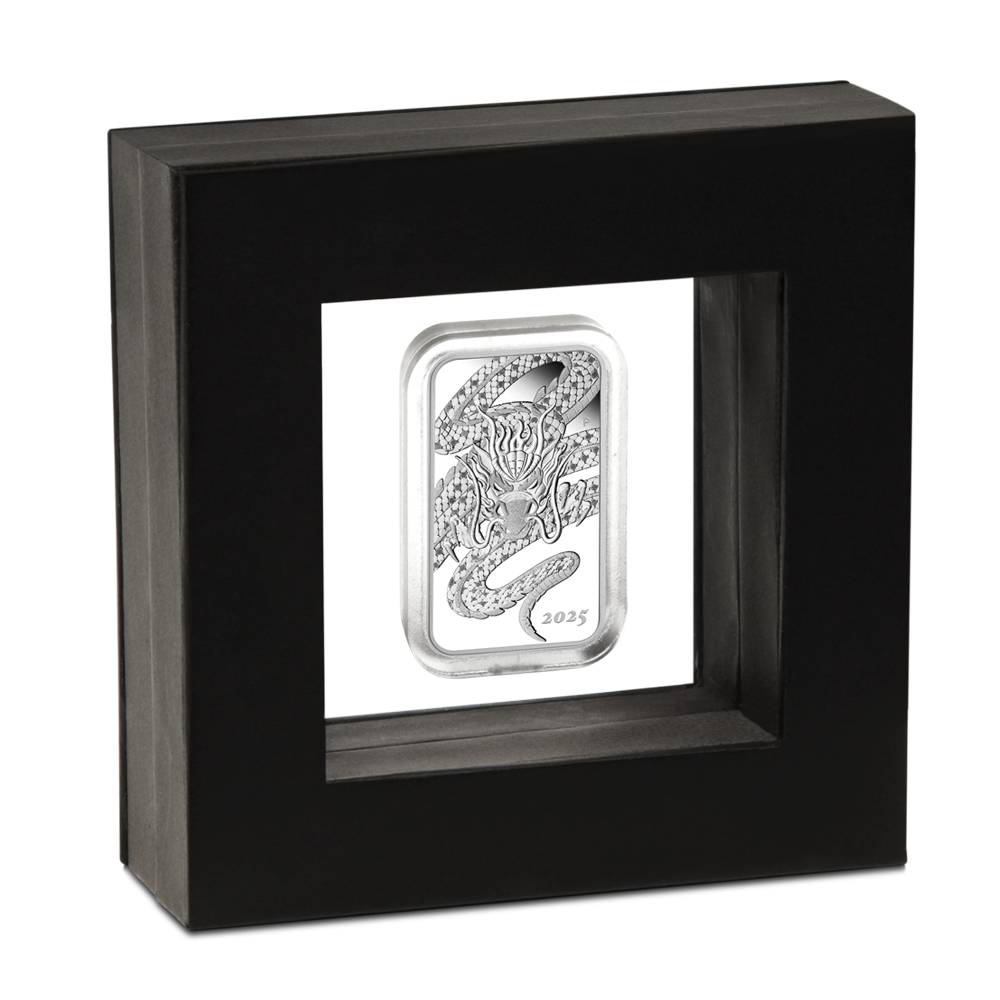 Each 2025 1 oz Proof Australian Rectangular Silver Dragon Coin comes inside a display window box and includes a themed shipper. Youll also receive a Certificate of Authenticity from the Perth Mint.