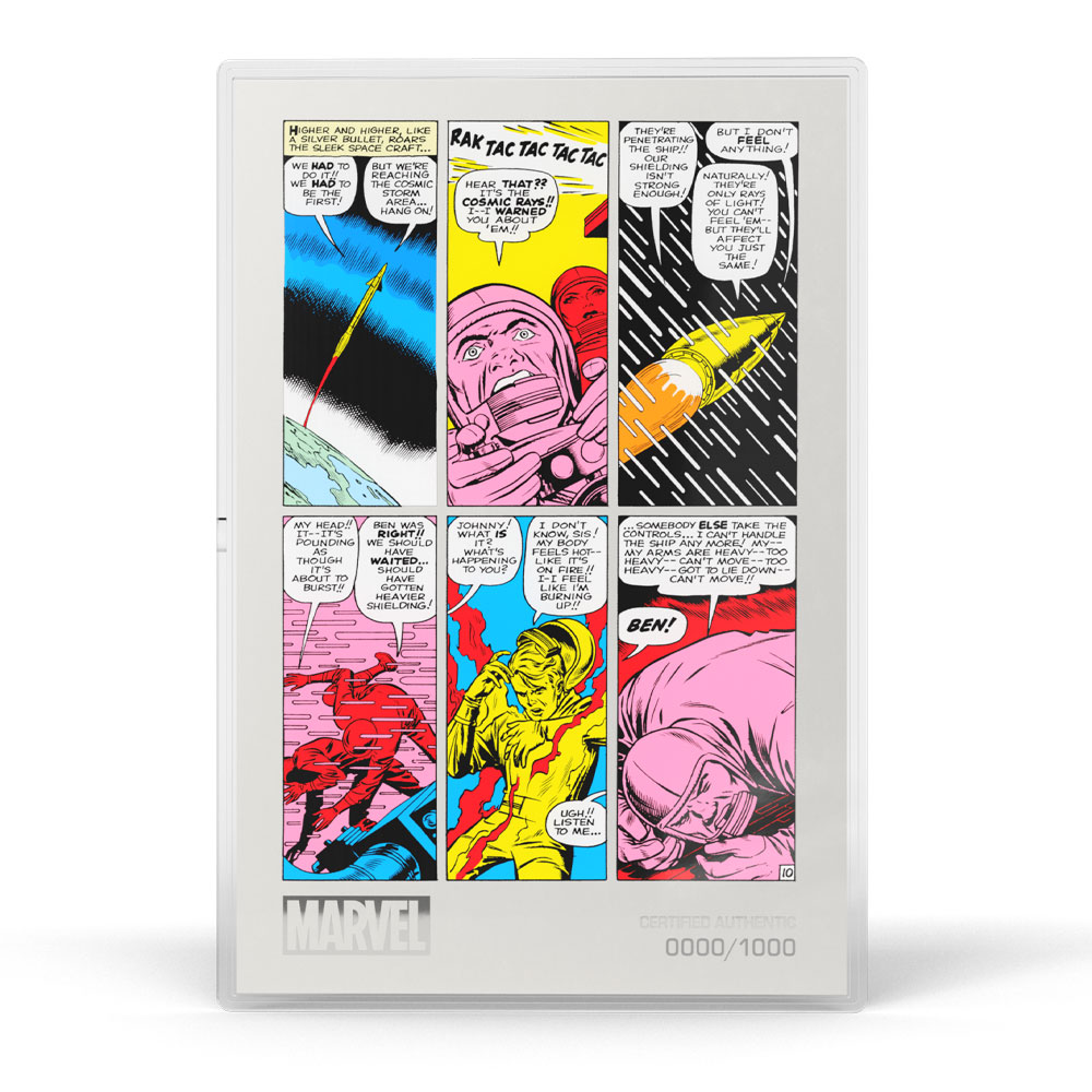 On the reverse of the coin, you’ll see color artwork from page 10 of Fantastic Four #1. The design uses Kirbys original color palette to recreate the action and layout seen in the early part of the story.