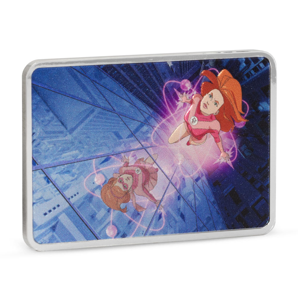The reverse of the 2025 1 oz Proof Colorized Silver Iconic Episodes Atom Eve Coin features art from the animated episode. The design stays true to the series style while shifting the focus to quiet, emotional scenes that contrast with the shows usual fast-paced action.