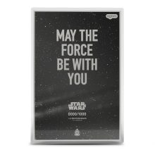 Each 2025 1 oz Proof Colorized Niue Silver Star Wars A New Hope Foil Coin is packaged in a display box with a Certificate of Authenticity. The reverse showcases colorized artwork inspired by the film, while the proof visuals enhance the design with mirrored and frosted details. Each coins obverse carries a unique serial number.