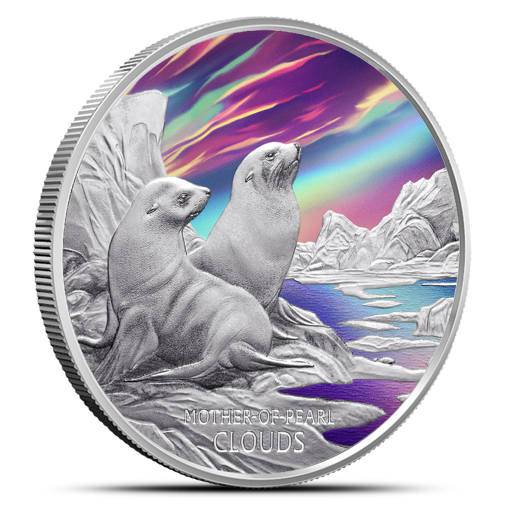For the reverse of the 2025 1 oz Proof Colorized Silver Mother of Pearl Clouds Coin, two seals are shown resting on an ice shelf. The scene is set against a backdrop of sky and clouds highlighted with a mother-of-pearl finish. Seals often thrive in areas where coastal waters are rich in nutrients and food is abundant.