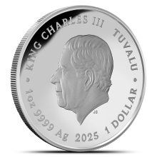 The obverse of the 2025 Proof Colorized Tuvalu Silver Mother of Pearl Clouds Coin shows King Charles III in left-profile relief. This first official portrait of the monarch was designed by Jody Clark and does not include a crown.