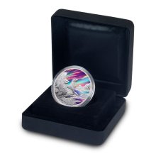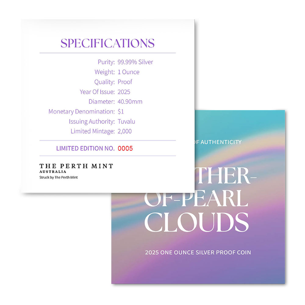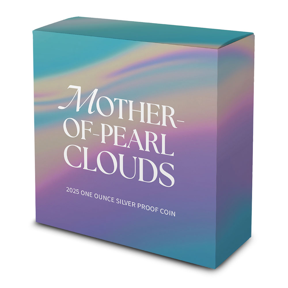 Each 2025 1 oz Proof Colorized Tuvalu Silver Mother of Pearl Clouds Coin comes packaged in a presentation box and is accompanied by an outer sleeve and Certificate of Authenticity. The reverse design includes a mother-of-pearl background, while both sides have a proof strike.