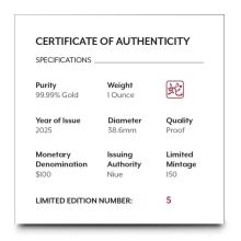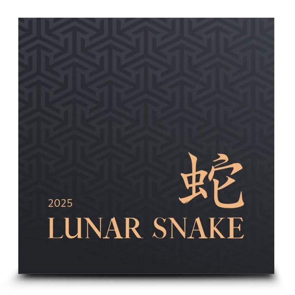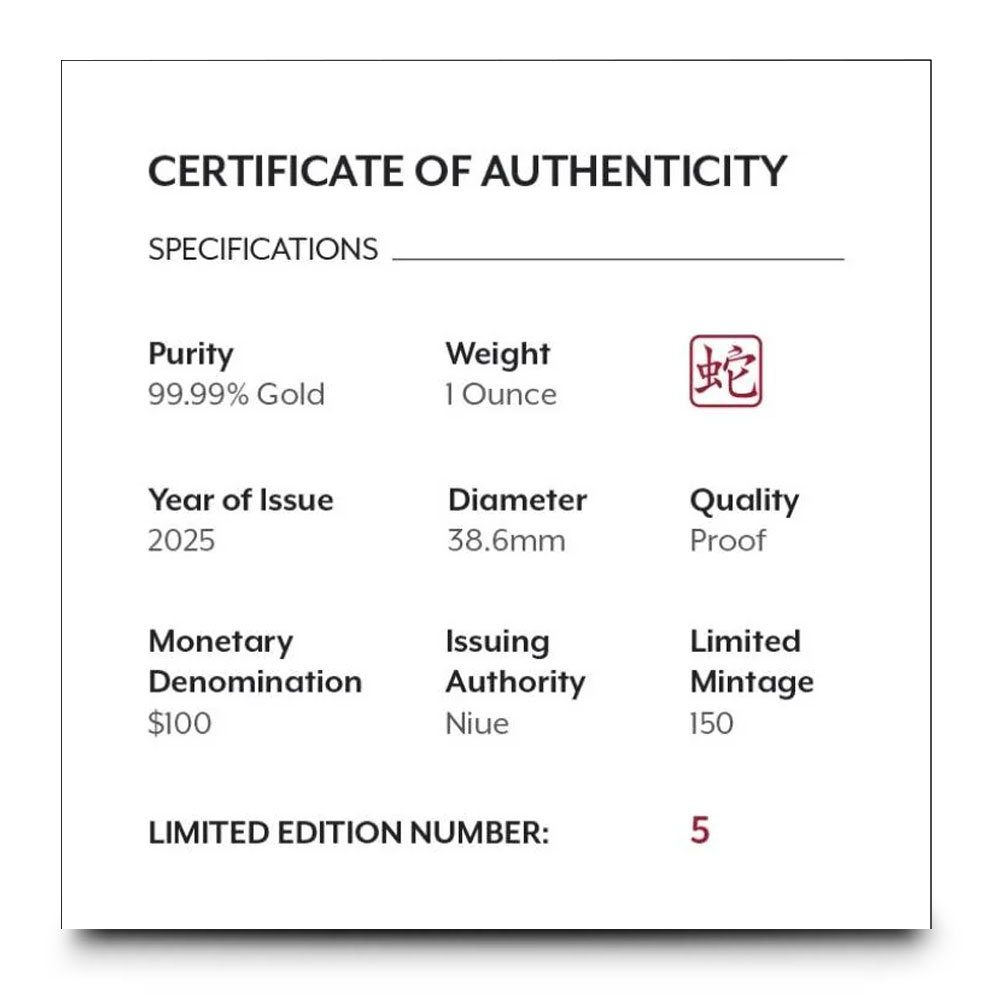 Each 2025 1 oz Proof Niue Gold Lunar Year of the Snake Coin at BGASC comes with stunning proof visuals that showcase frosted details against a polished background. The coin is safely stored in a capsule and presented in a black display box. This box is protected by a themed shipper and includes a Certificate of Authenticity, ensuring its provenance.