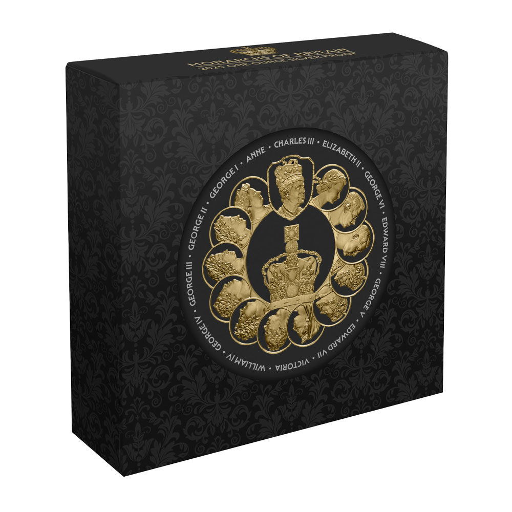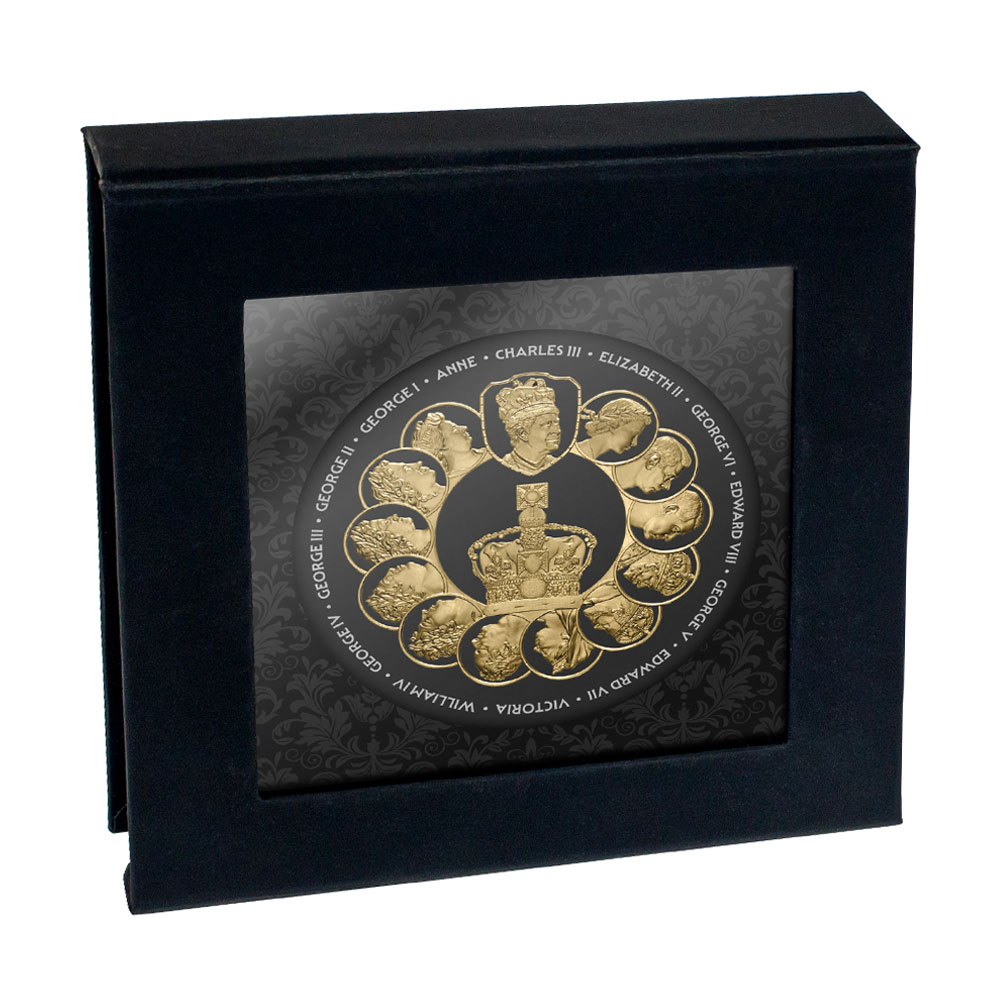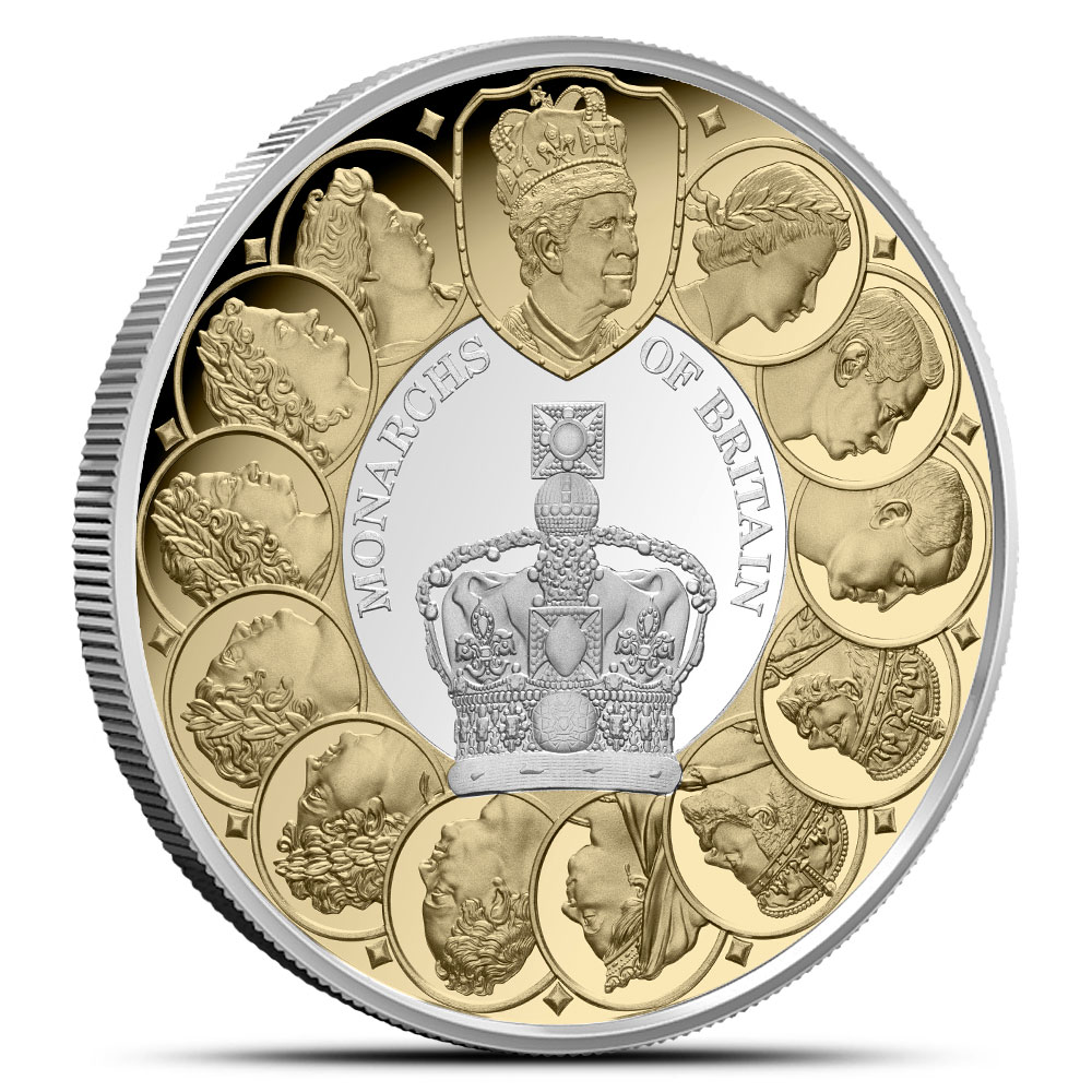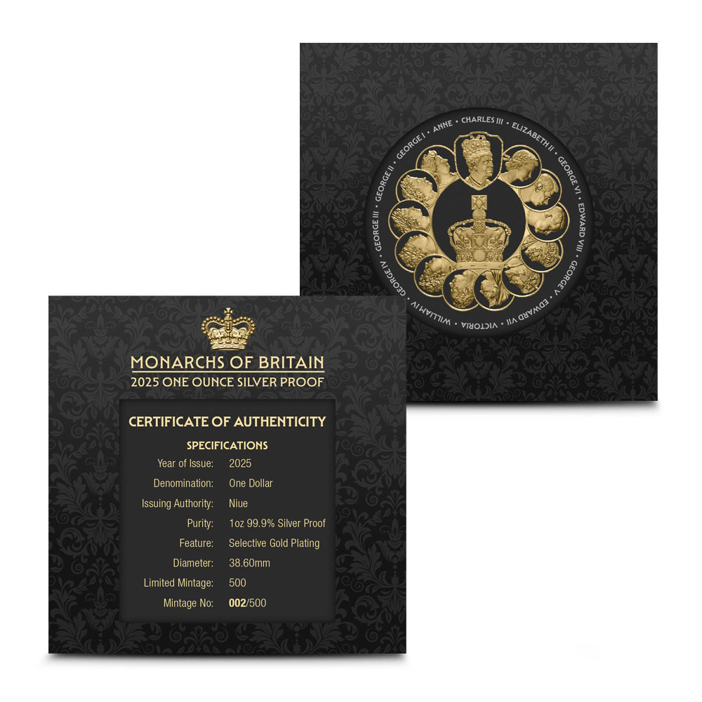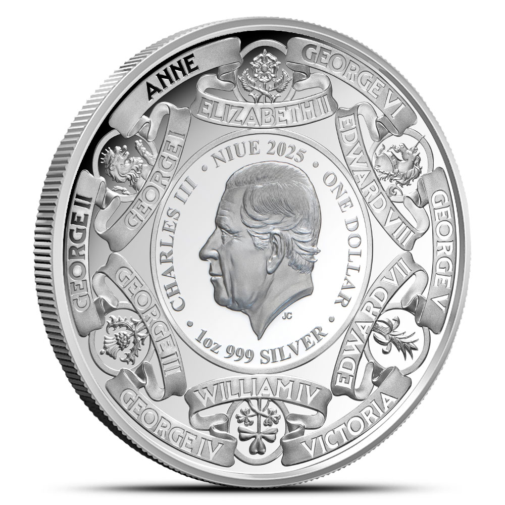 Home » Gold, Silver and Platinum Bullion » Buy Silver Bullion Coins, Bars, and Rounds » 2025 1 oz Proof Niue Monarchs of Britain Silver Coin (Box + CoA, Gold Plating)