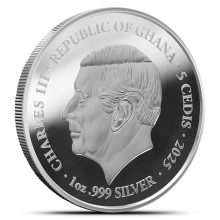 On the obverse of the 2025 Proof Republic of Ghana Silver James the son of Zebedee Coin, youll see a left-facing portrait of King Charles III. This design was created by artist Jody Clark, who also designed the final portrait of Queen Elizabeth II. King Charles is shown without a crown in this artwork.