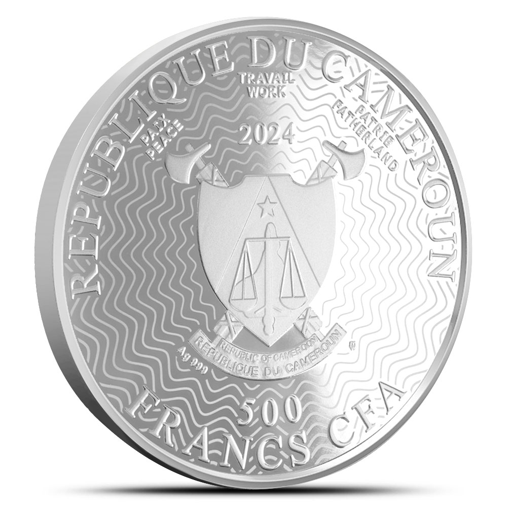 The obverse of the 2024 17.5 Gram Proof Colorized Silver Edvard Munch Coin includes Cameroons coat of arms. In this image, two crossed axes sit behind a shield. The shield shows a balanced scale with a single star overhead, symbolizing fairness and national values.