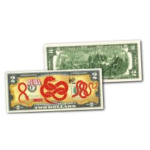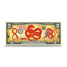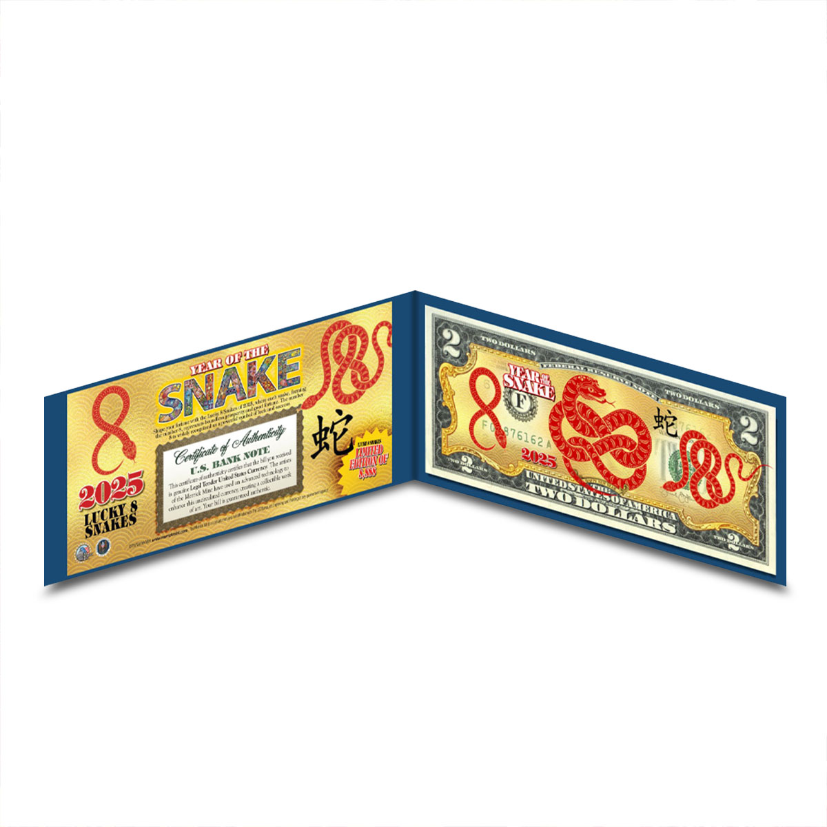 These 2025 $2 Lucky 8 Year of the Snake Legal Tender Notes come with red presentation envelopes that include a Certificate of Authenticity. These crisp, uncirculated $2 Federal Reserve Notes have been enhanced by Merrick Mint with the beautiful golden hologram effects and red snakes featured on the obverse.