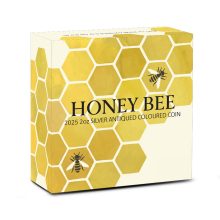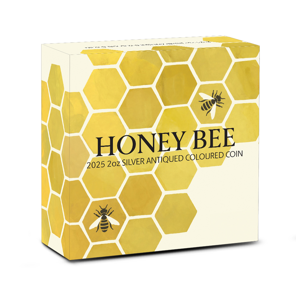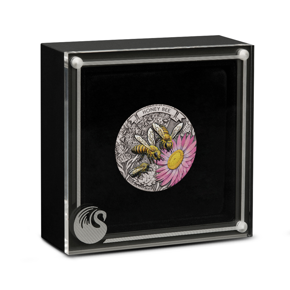 Each 2025 2 oz Antique Colorized Australian Silver Honey Bee Coin is housed in a Perth Mint display case. The coin is held in place with a soft foam insert and protected with a clear acrylic lid. The outer packaging features a bee-themed shipper, and each coin is shipped with a Certificate of Authenticity from the mint. The rimless coin is finished with an antique look and includes color on the reverse to enhance the design.