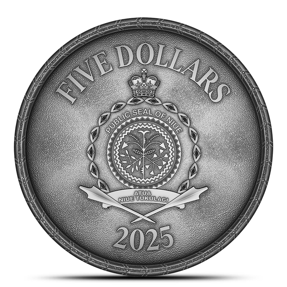 Every 2025 2 oz Antique Niue Silver Ghisi Shield Convex Concave Coin is shipped with a presentation box and includes a Certificate of Authenticity. Its obverse is concave, while the reverse side features a raised, domed shape. Both sides showcase a traditional antique finish.