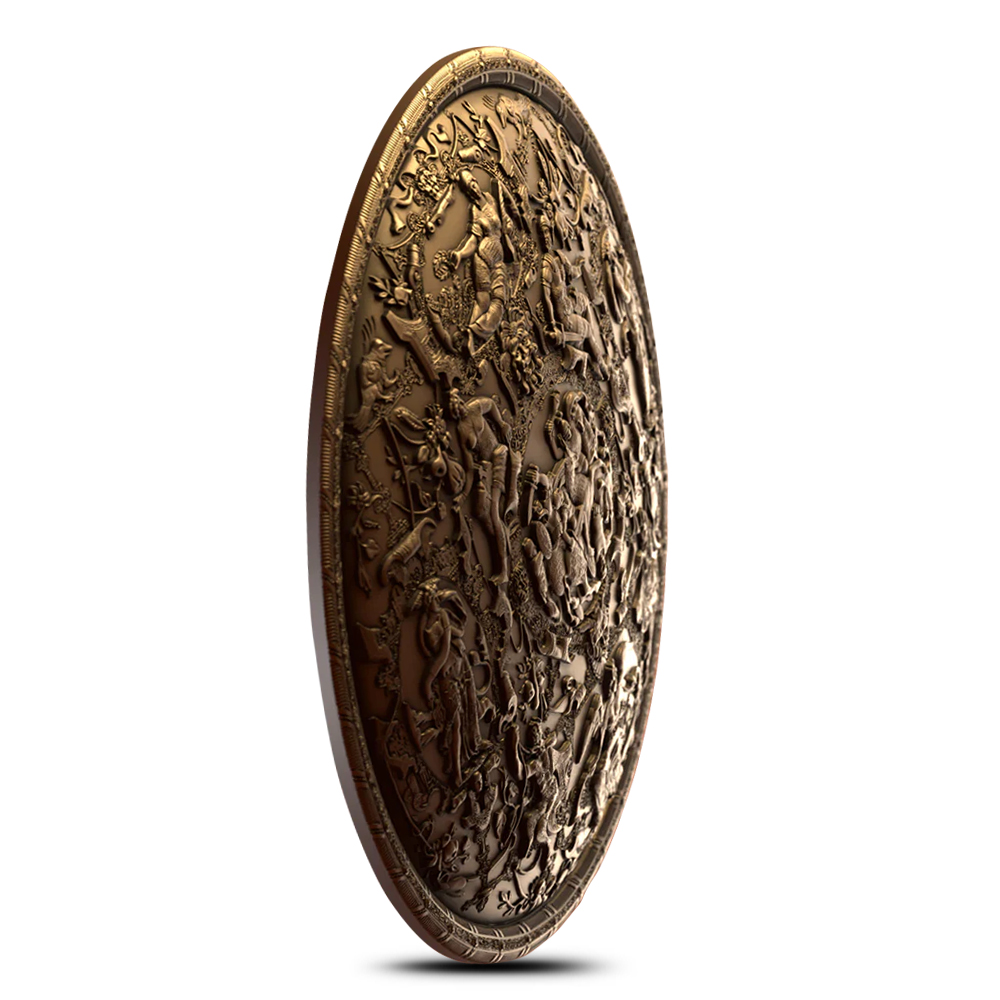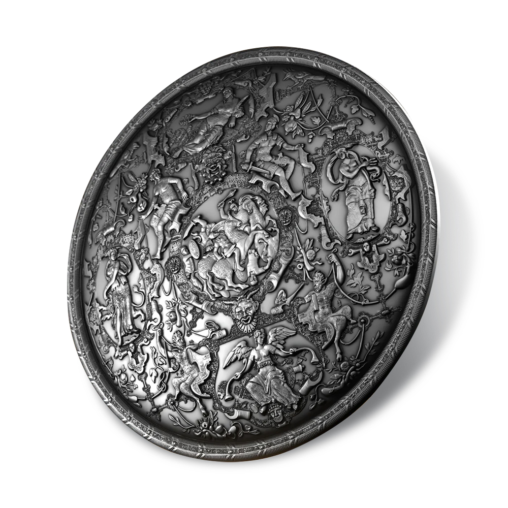 The reverse of the 2025 2 oz Antique Silver Ghisi Shield Coin presents the Ghisi Shield itself. Originally crafted by Giorgio Ghisi in 1554, the design features a central battle scene surrounded by four panels, each showing an allegorical figure: Victory, Fame, Fortitude, and Prudence.