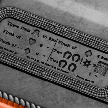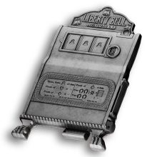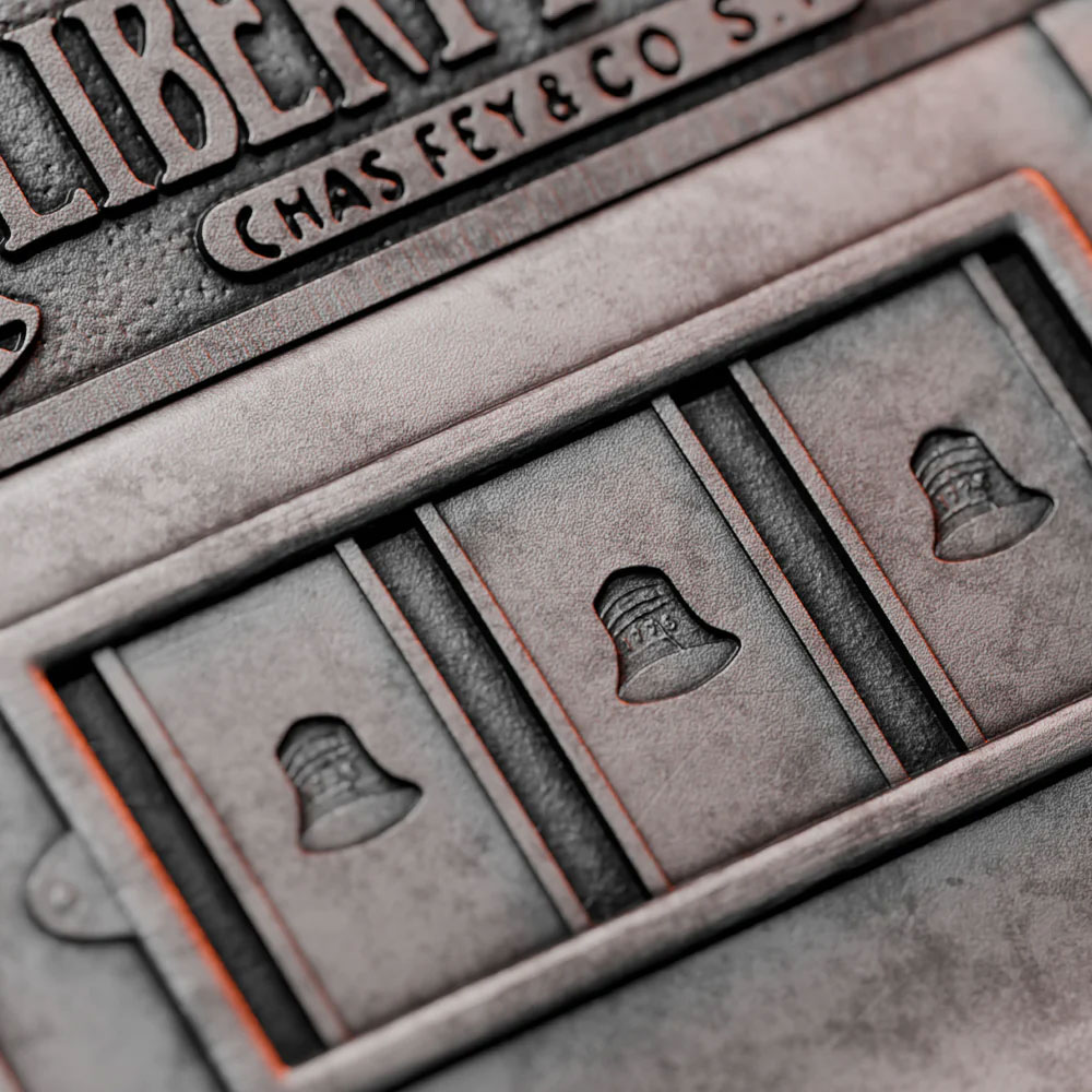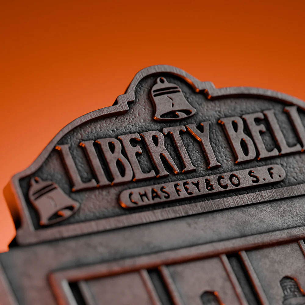 The reverse recreates the original Liberty Bell slot machines appearance. It displays three reels with Liberty Bells in a winning combination and features payout details for additional combinations at the base of the design.