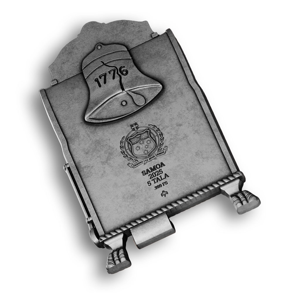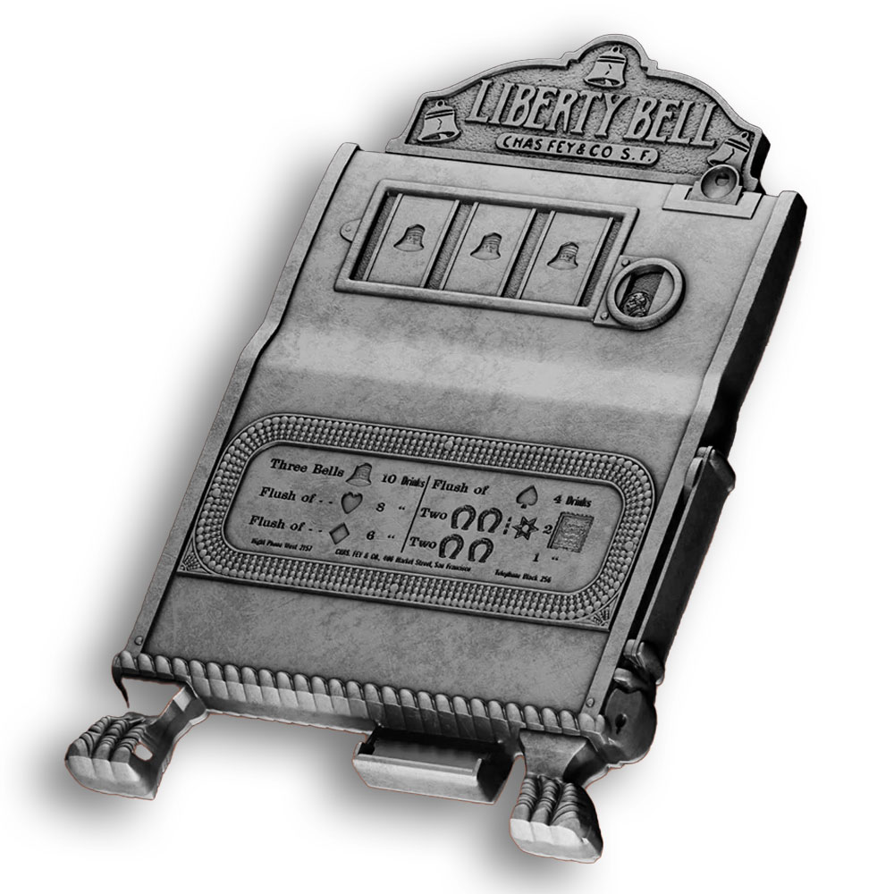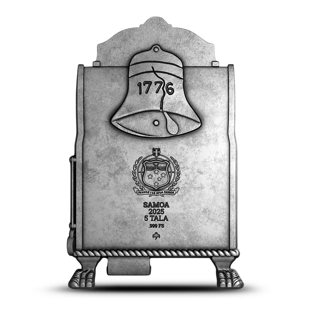 Each 2025 2 oz Antique Samoa Silver Liberty Bell Slot Machine Coin is shipped with a display box and a Certificate of Authenticity. These coins have an antique finish and are shaped to resemble the original Liberty Bell slot machine from over a century ago.