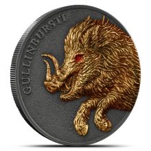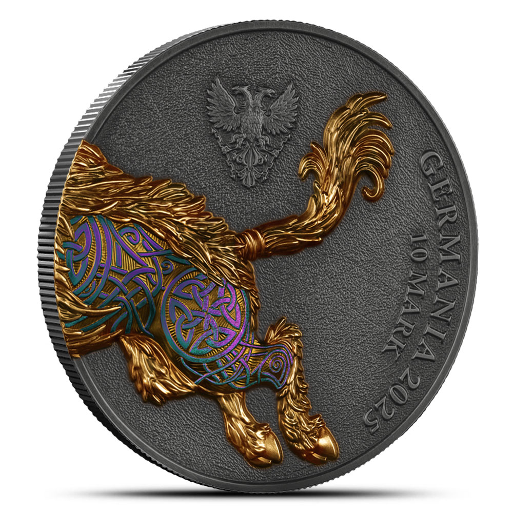 Each 2025 2 oz Germania Beasts Gullinbursti Silver Round arrives in Brilliant Uncirculated condition. The piece is enhanced with a dark ruthenium layer, a UV-reactive surface on the creature itself, and 24-karat gold gilding on the boar, with selectively colored eyes on the front.