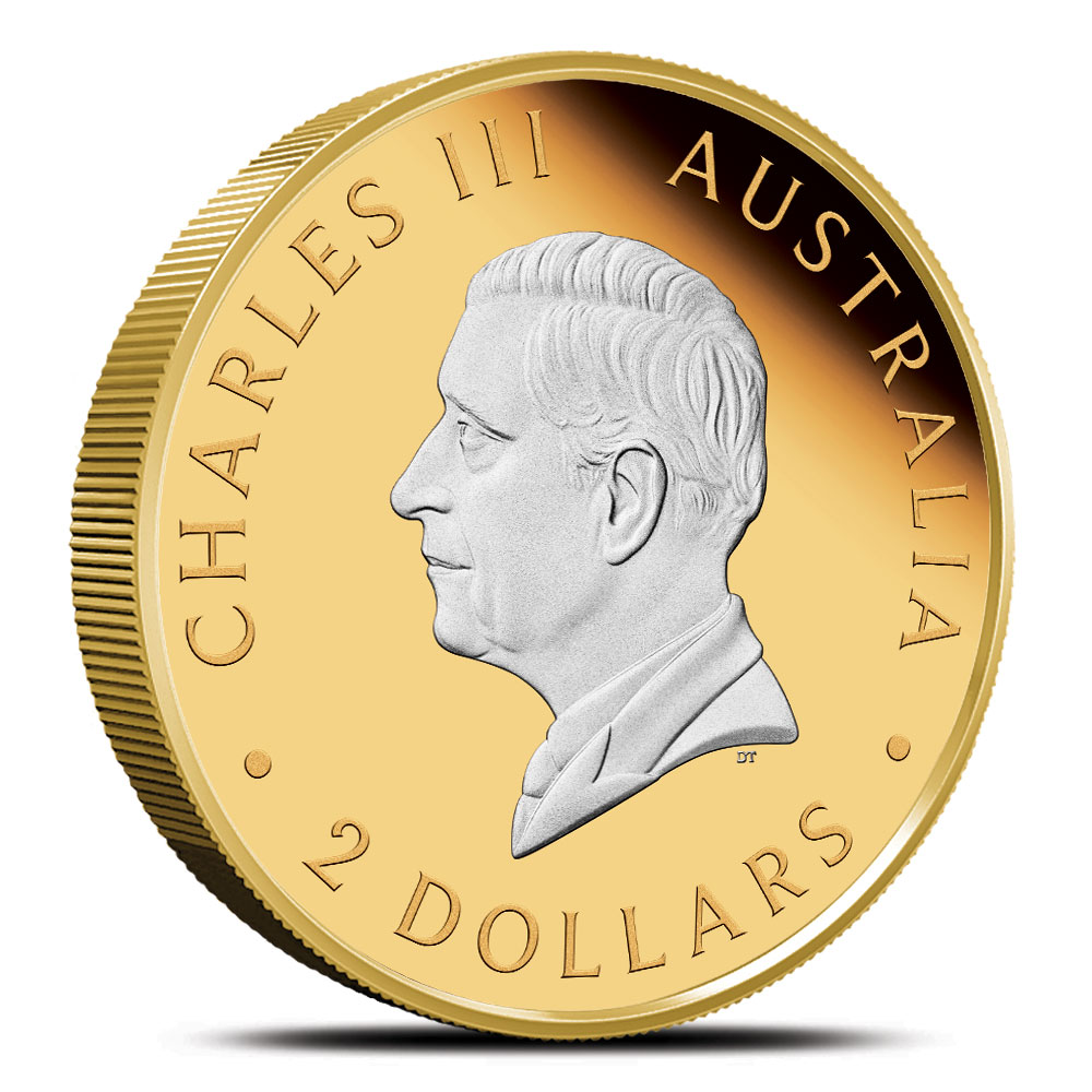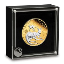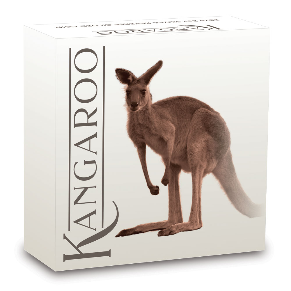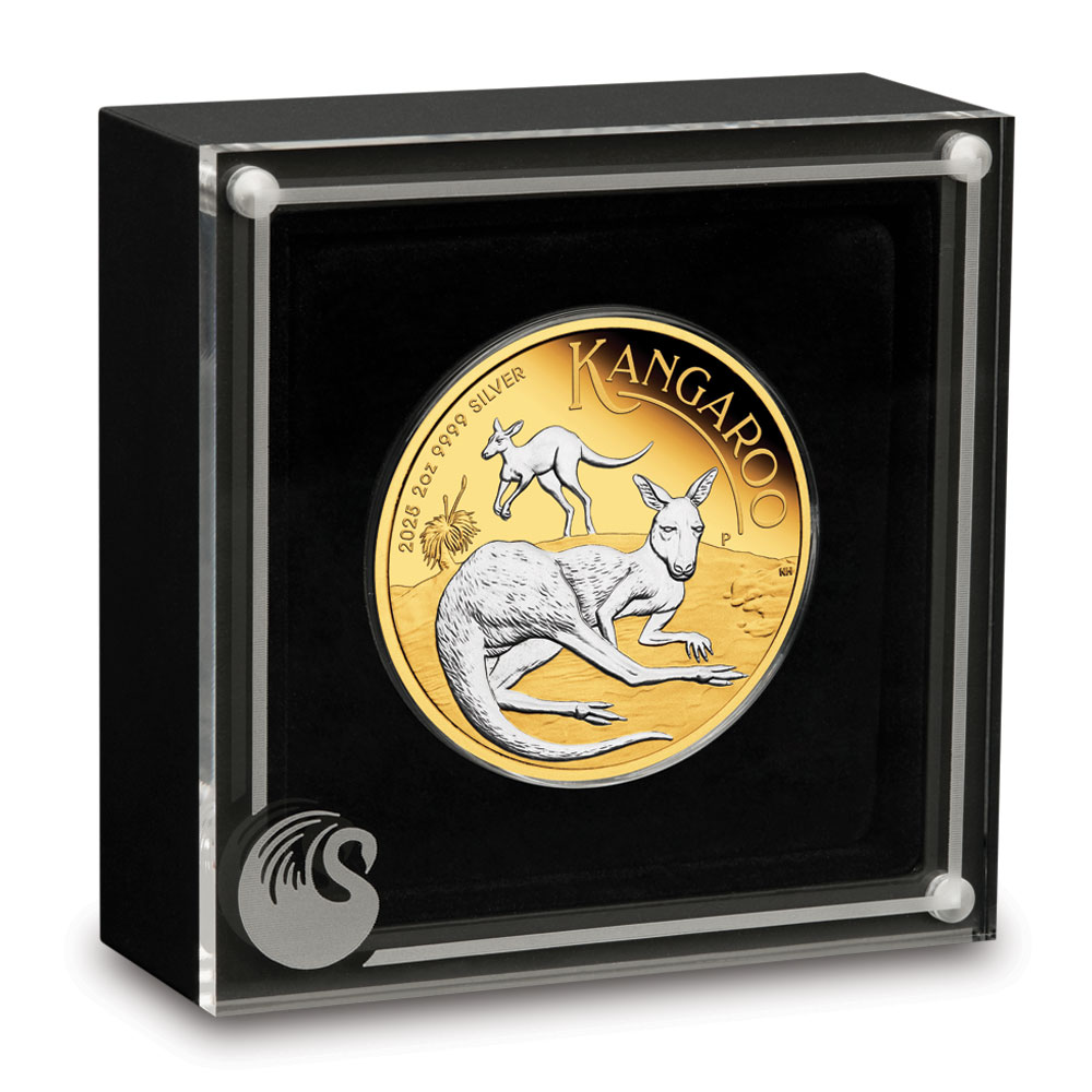 Home » Sovereign & Private Bullion Mints » Perth Mint » 2025 2 oz Proof Australian Silver Kangaroo Coin (Reverse Gilded, Box + CoA)