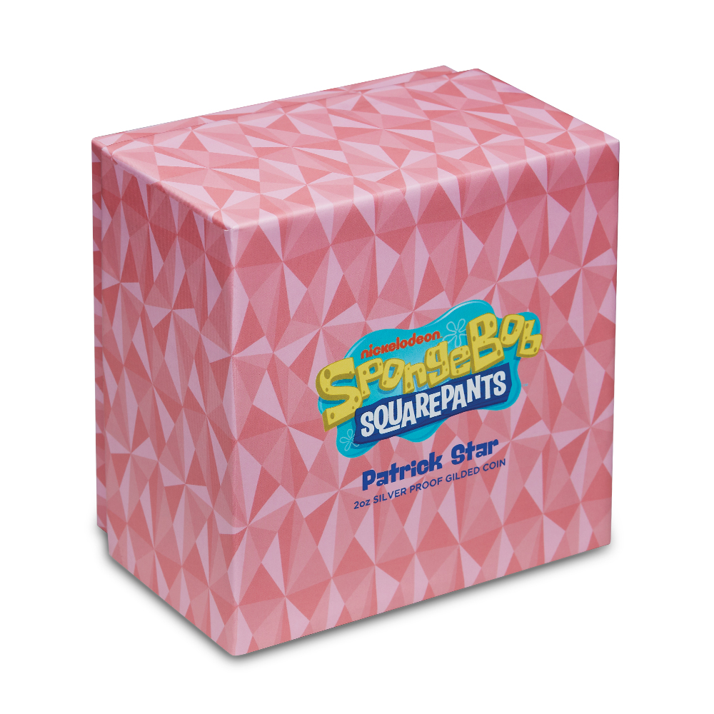 Each 2025 2 oz Proof Tuvalu Silver SpongeBob SquarePants Patrick Star Coin comes packaged in a themed box designed to look like Patricks rock. This presentation includes a SpongeBob-themed shipper and a Certificate of Authenticity. The coin has a pink gold layer on both the image of Patrick and the outer edge.