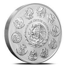 On the obverse of the 2025 2 oz Reverse Proof Mexican Silver Libertad Coin, the modern national seal of Mexico is featured. The image shows a golden eagle turned to the left, clutching a serpent with its beak and claw. The eagle stands on a prickly pear cactus growing from a rock. Ten smaller historic versions of the national emblem surround this central seal.