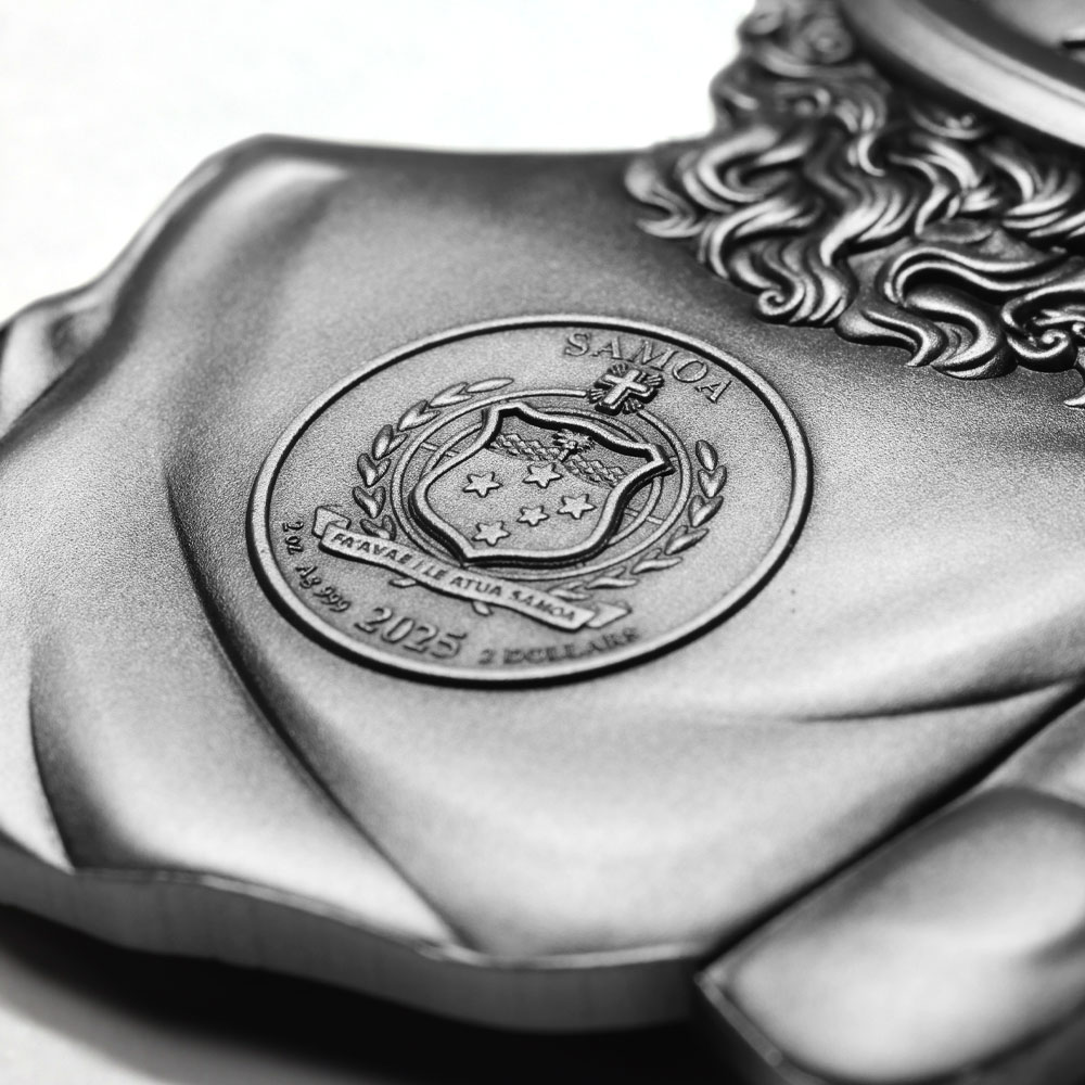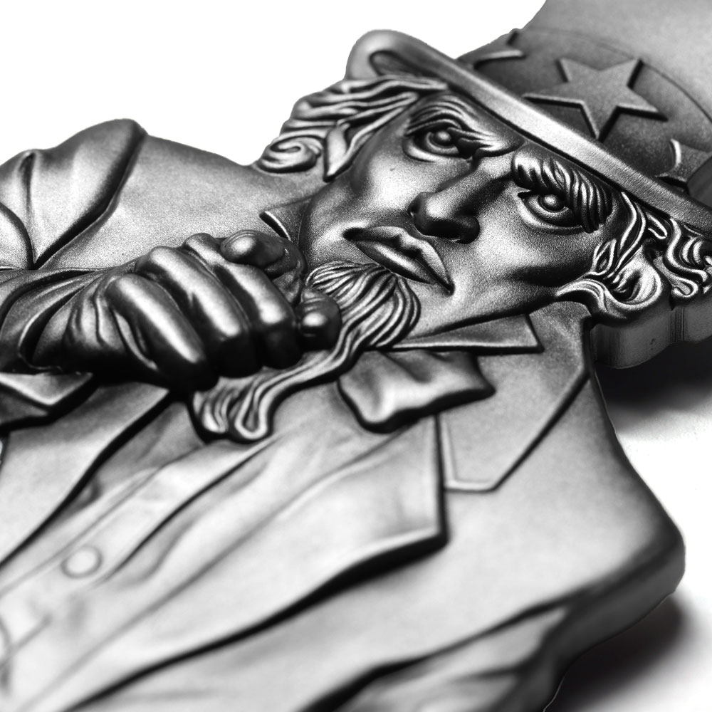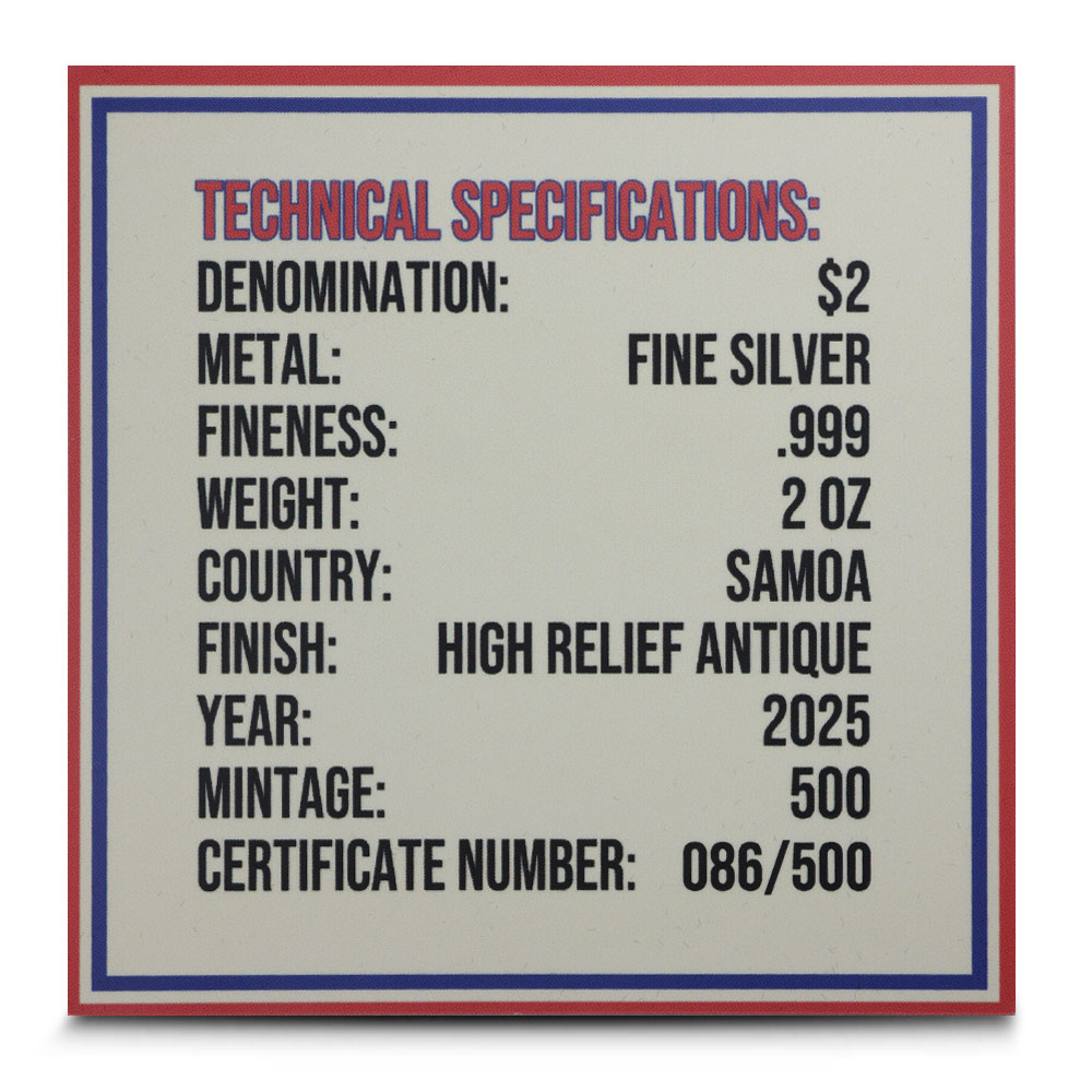 All 2025 2 oz Samoa Silver Uncle Sam Shaped Coins are packaged with care, featuring a presentation case and Certificate of Authenticity. The antique polish and high-relief strike bring the classic design to life, all crafted in the unique shape of Uncle Sam.