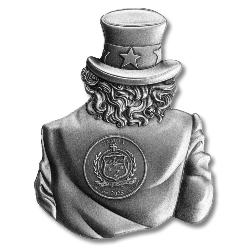 The character of Uncle Sam became linked to the United States government during the War of 1812, and his familiar image developed over time. The name is believed to have originated with Samuel Wilson, a meat supplier from Troy, New York. Wilson provided beef barrels to the army, marked “U.S.” for United States, but troops began referring to them as coming from “Uncle Sam.” Right now, you can purchase 2025 2 oz Samoa Silver Uncle Sam Shaped Coins from BGASC.