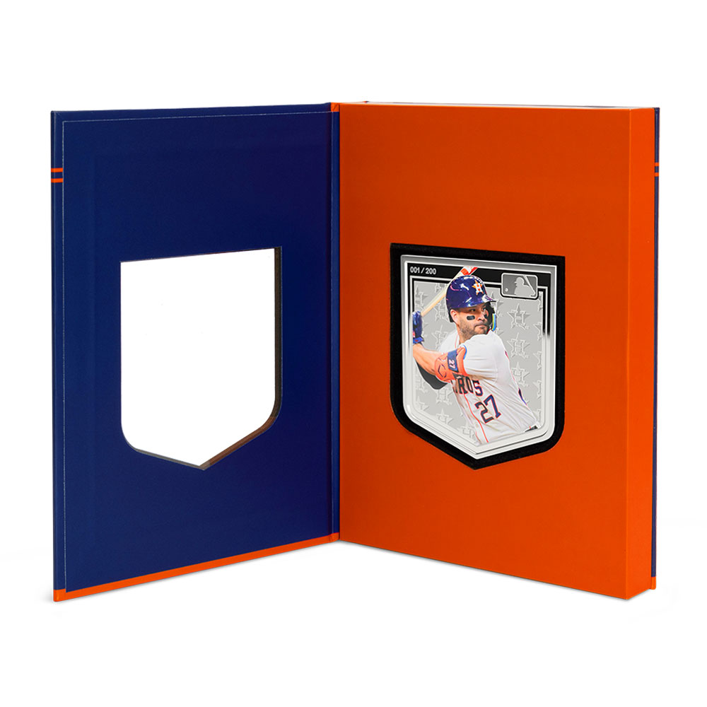 Every 2025 3 oz Proof Colorized Niue Silver Major League Baseball Jose Altuve Coin is housed in a presentation box and comes with a Certificate of Authenticity. Each coin carries its own serial number on the reverse, which also displays the full-color design. Both sides feature the frosted details and mirrored backgrounds typical of proof strikes.