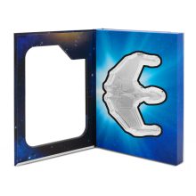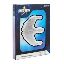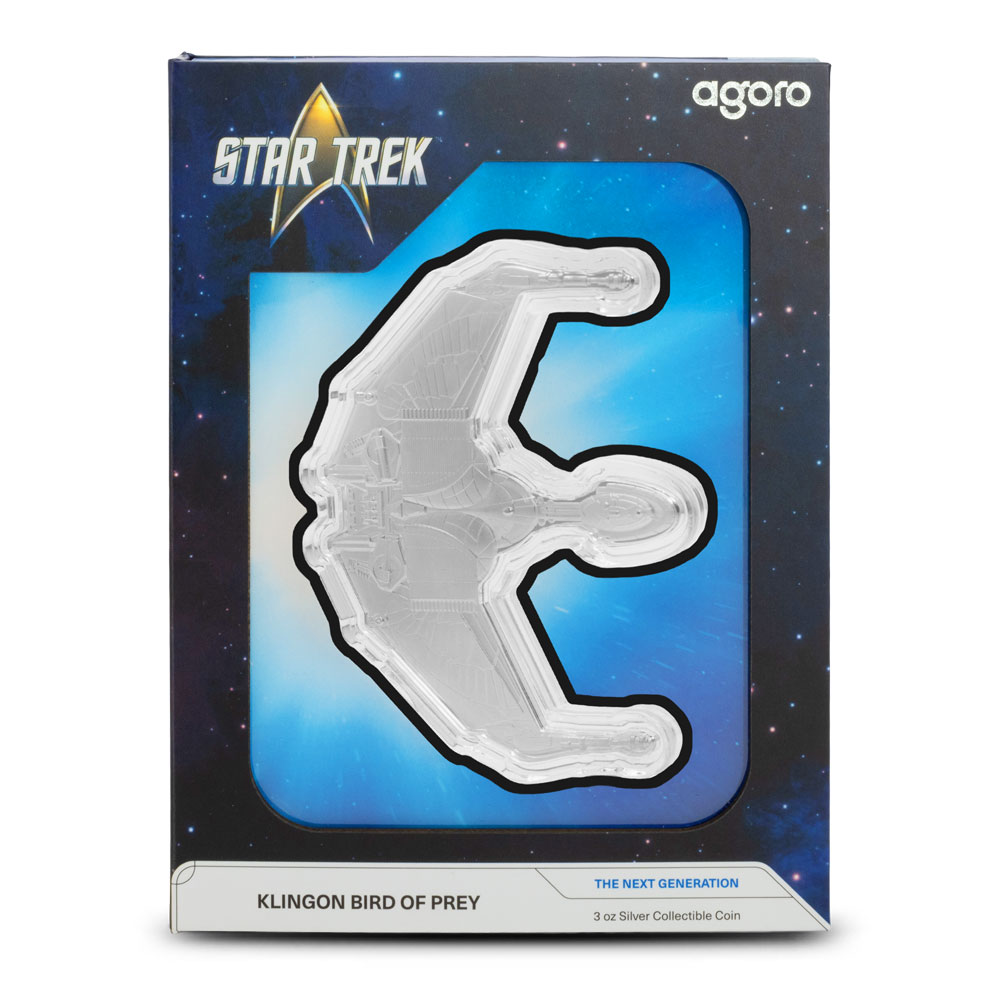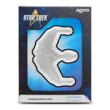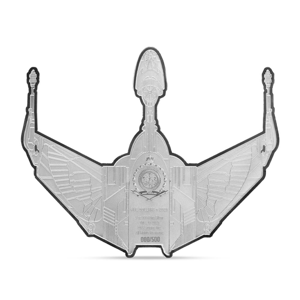 The 2025 3 oz Proof Niue Silver Star Trek Ships Klingon Bird of Prey Coin is delivered in a presentation box and arrives with a Certificate of Authenticity. These proof coins use frosted and polished surfaces to bring out the details of the ships construction.