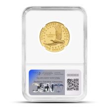 Each 2025-W 1/2 oz Proof American Gold 25th Anniversary Sacagawea Golden Dollar Coin available here is certified PF70, meaning it has perfect strike, full luster, and no visible marks. The UCAM designation highlights the strong contrast between the frosted designs and clear, mirror-like fields. First Day of Issue coins are those sent in for certification within the first day after release.