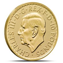 On the obverse of the 2026 1/10 oz Gold Britannia Coins is King Charles III. Sculpted by Martin Jennings in 2022, this was the first official design of the King for British currency. It shows the King in left-profile, without a crown.