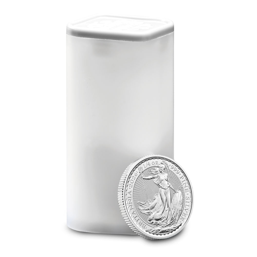 Each 2026 1/4 oz British Silver Britannia Coin comes in Brilliant Uncirculated condition. Single coins are packaged in plastic flips, while quantities of 19 are shipped in acrylic tubes.