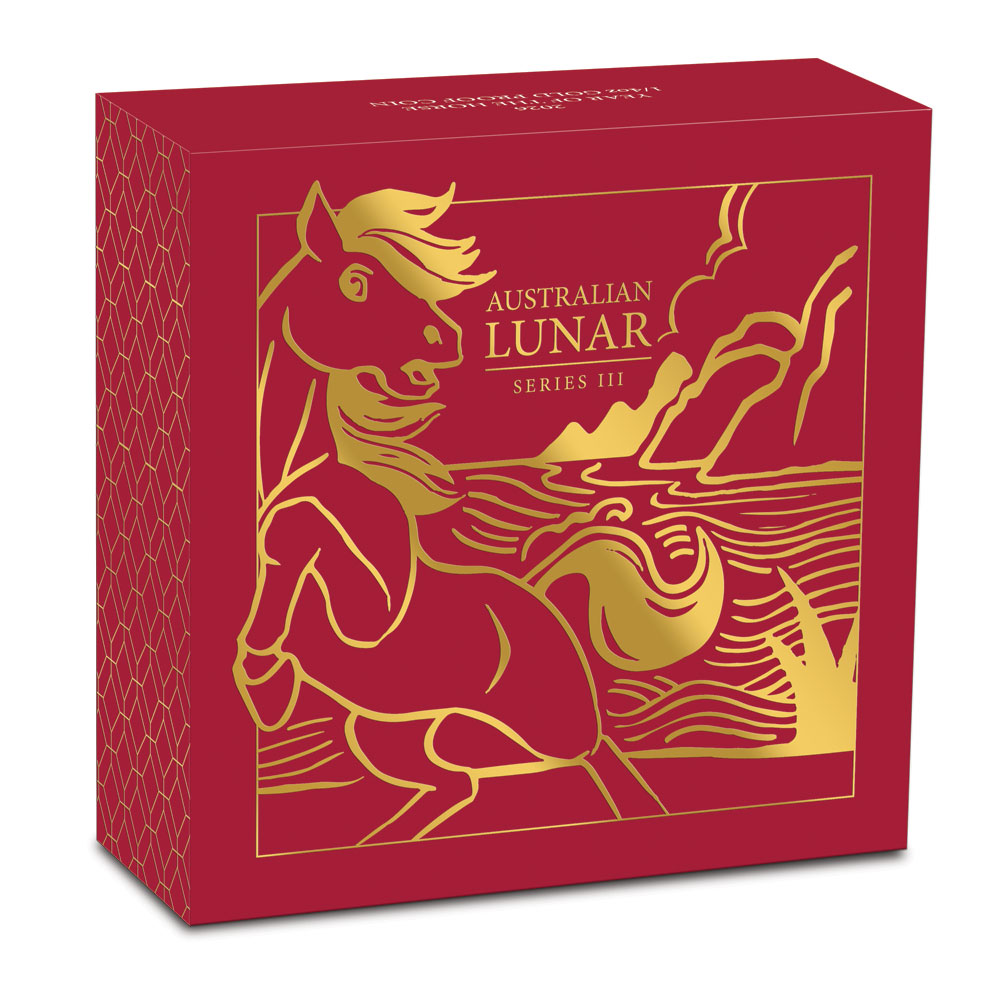 All 2026 1/4 oz Proof Australian Gold Lunar Horse Coins ship in original Perth Mint packaging, which includes a red display box, a themed outer shipper, and a Certificate of Authenticity. Perth Mint limits this release to just 3,500 coins in this edition.