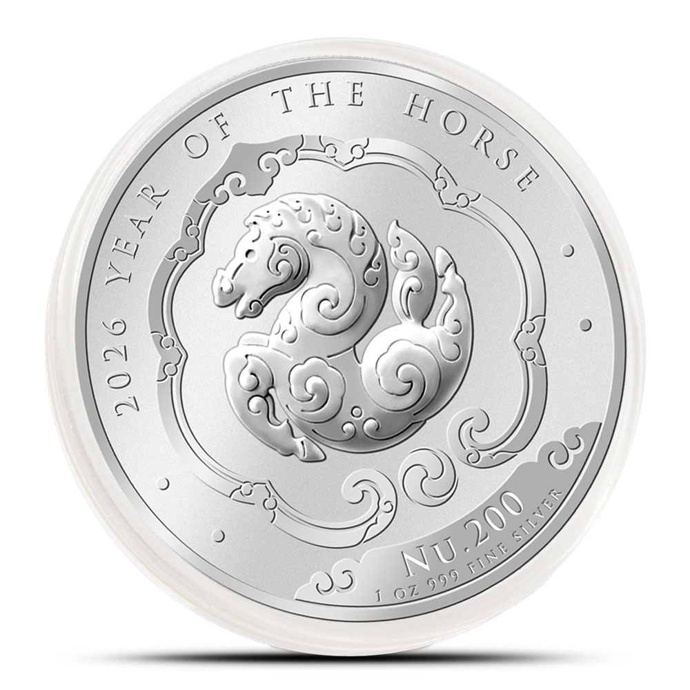 Each 2026 1 oz Kingdom of Bhutan Lunar Horse Silver Coin comes in Brilliant Uncirculated condition and is individually packaged in a protective capsule. This release continues the Happiest Lunar Series with the 2026 issue.