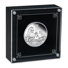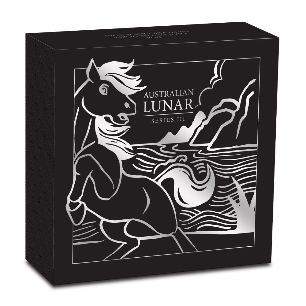 The 2026 1 oz Proof Australian Silver Lunar Horse Coin is presented in a black Perth Mint display case with a clear, acrylic lid. The coins packaging also includes a Lunar Horse-themed shipper and a Certificate of Authenticity.