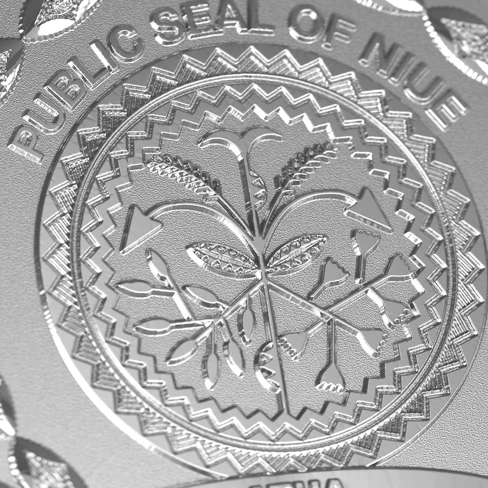 On the obverse of the 2026 2 oz Proof Silver THUG-QT Coin, youll find the Public Seal of Niue. The design includes seashells and local plants encircling a crown at the top. To enhance the theme, bullet hole marks are added to the field, symbolizing rounds passing through the target.